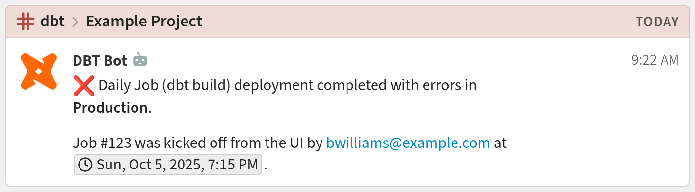 If you'd like your notification messages to link to your DBT job runs, make sure you include the DBT Access URL when generating the integration URL.